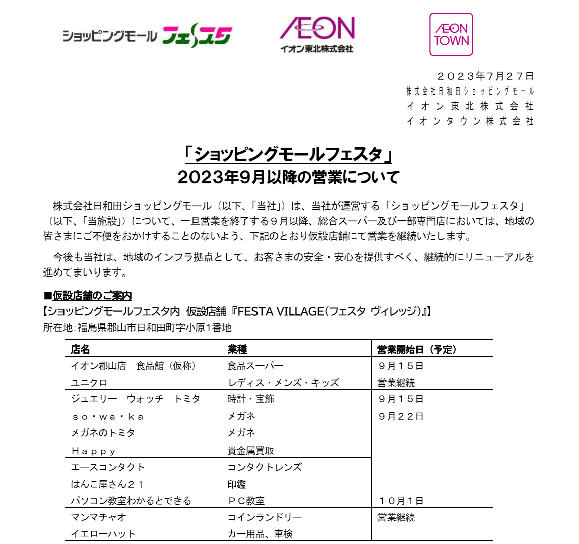 現在、ショッピングモールフェスタは仮設店舗での営業となっています。